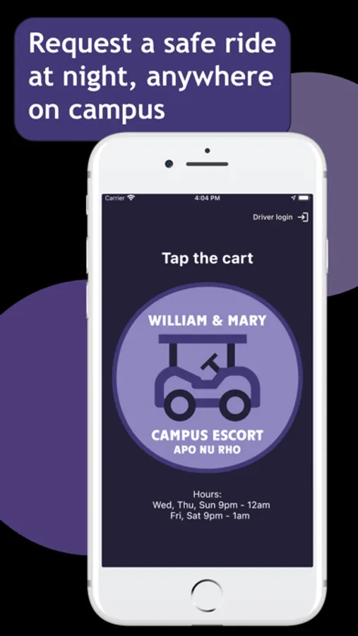 APO’s safe, prompt, and friendly Campus Escort service will take William & Mary students wherever they need to go on campus. With our mobile app, you can request a safe, prompt ride without calling us. The best part, it’s FREE for all W&M students!