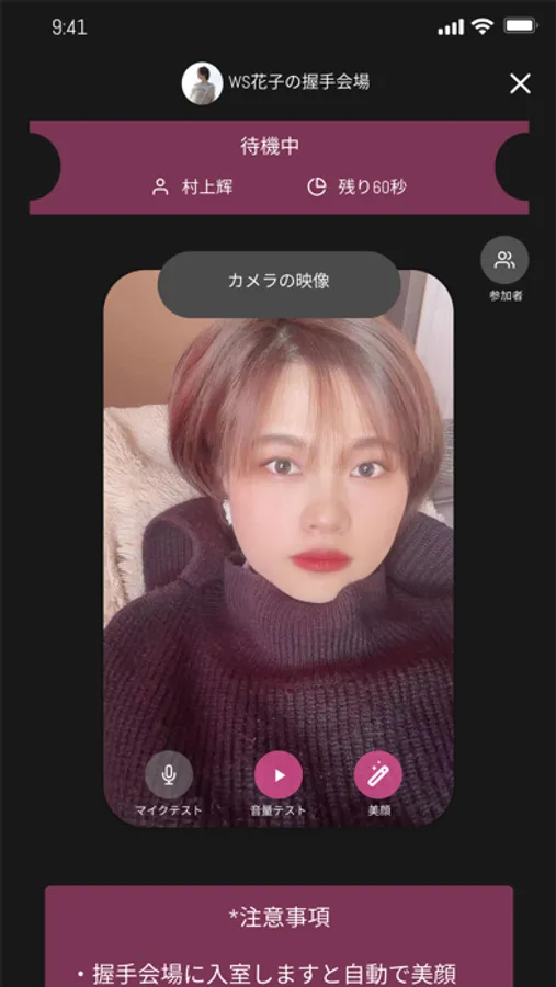 ◆ 配信者は待機室画面と通話画面で、参加者リストボタンをタップすることでいつでも参加者をチェックすることができます。