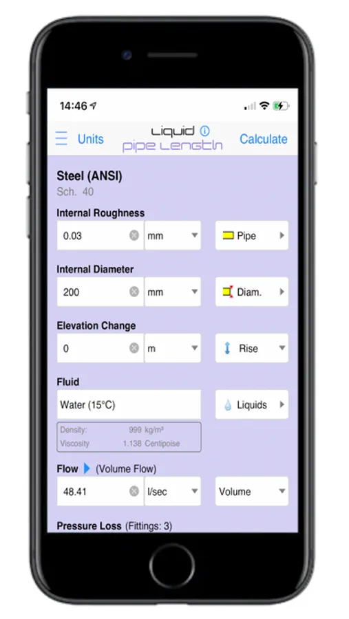 Pipe Flow Liquid Pipe Length is a calculator app from Pipe Flow Software that calculates the maximum length of pipe needed before a given pressure loss is exceeded for a specified flow rate in a known pipe diameter.