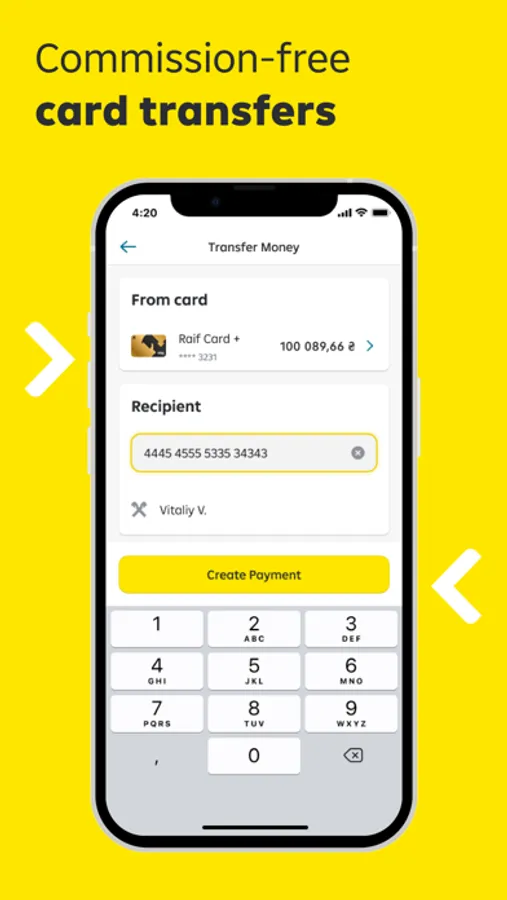 On the Main screen of the application, click on the "Transfer Money" button. Select the debit card from which you want to transfer money and enter the recipient's card number. Create a new transfer and pay the required amount. If the transfer is successful, you will receive a confirmation in the transaction history and transfer details.