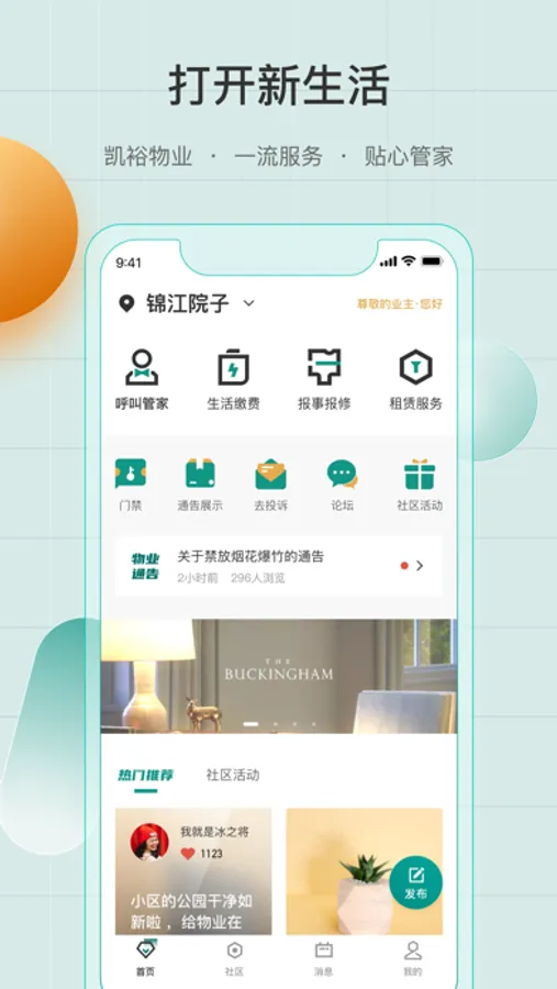 “凯裕物业”APP主要为业主打造便捷的物业服务,生活服务、邻里交流的社区生活服务平台,通过智能化手段推进物业服务企业更好的为小区业主服务。