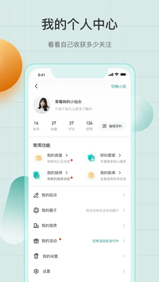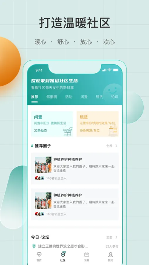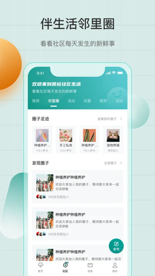 2、发布社区圈子,和邻居聊天、发布二手闲置、车位房屋租赁信息等。