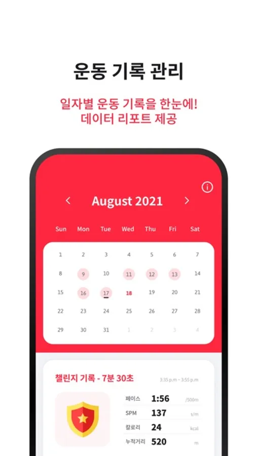 Through the calendar, you can check the records by date at a glance. Check total exercise time, total exercise distance, average SPM, calorie consumption, etc. every day. A real-time ranking and reward system according to the record is also being prepared.