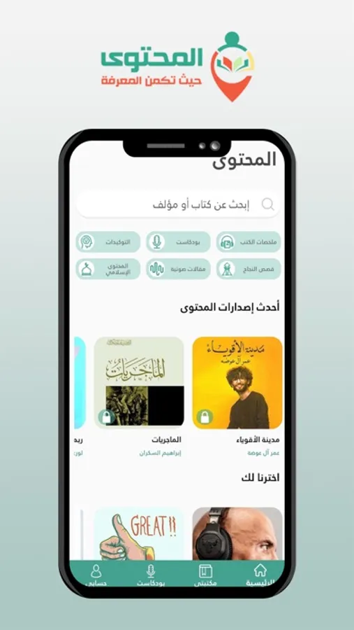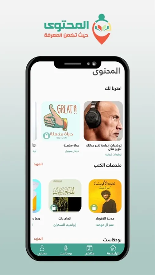 المحتوى تطبيق مبسط يهتم بتقديم ملخصات مسموعة لأكثر الكتب مبيعا فى العالم , كما يقدم مجموعة من الأقسام الأخرى