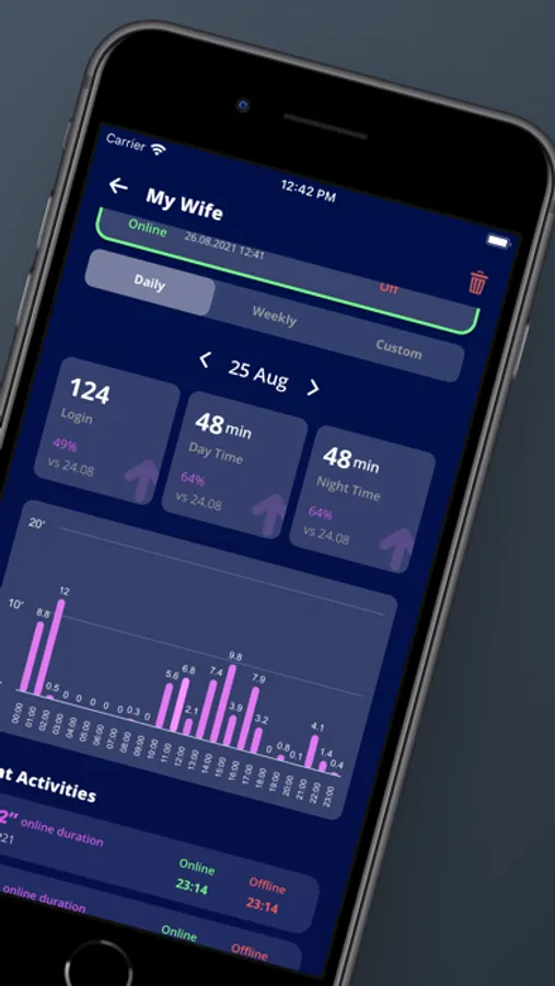 You can see how long the person you follow is online during the day, and can view at what hours s/he is logged in. Wona keeps the tracks of all his/her action history for you.