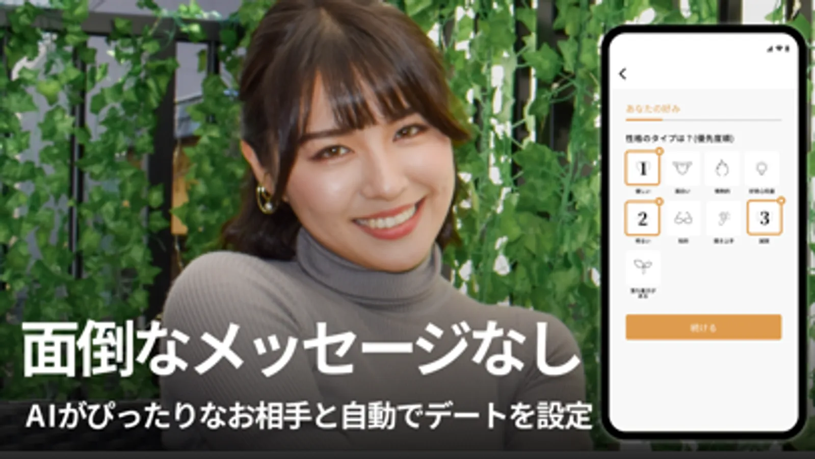 AIが好みの人と自動マッチング。いいねややりとりは一切不要で週1回デート保証!真剣な出会いを求める方のための婚活・恋活アプリです。