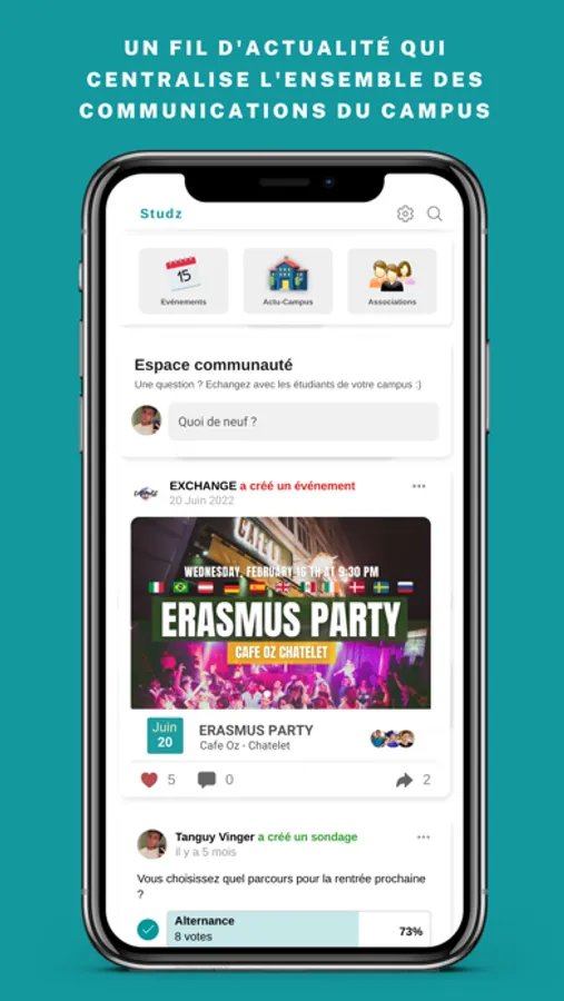 A campus-wide social network, Studz facilitates relations between students and associations, BDEs, and university administration.