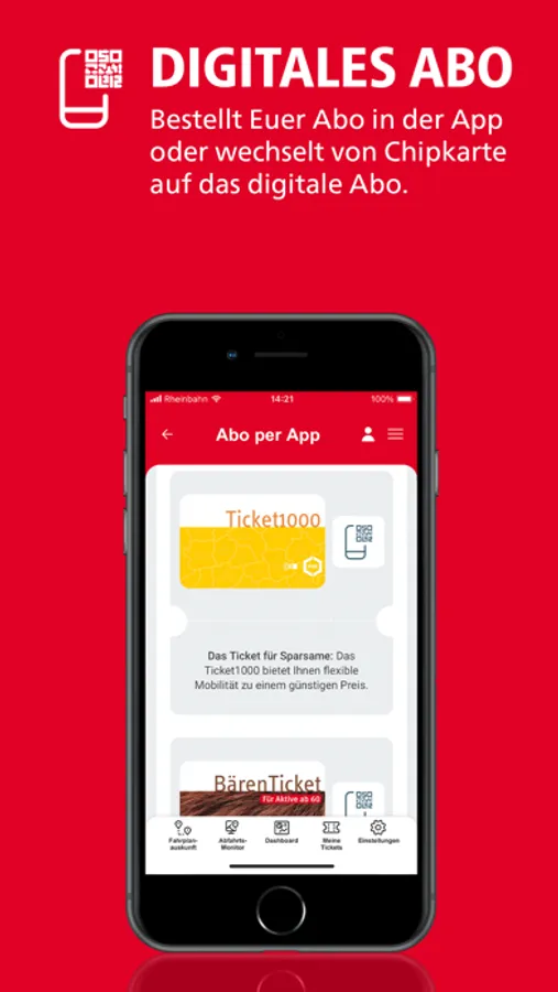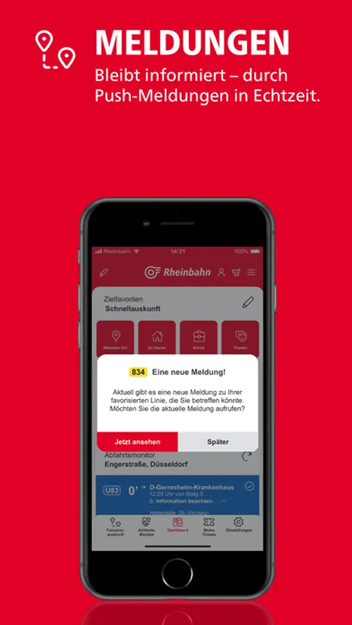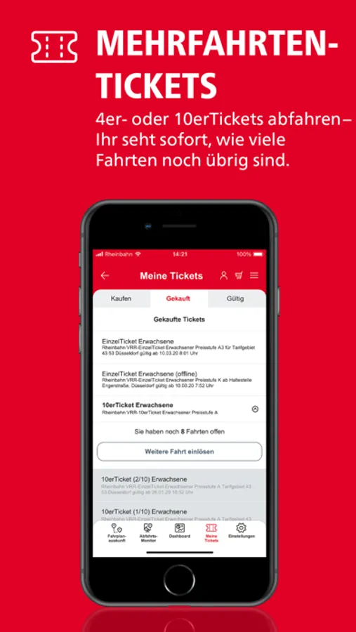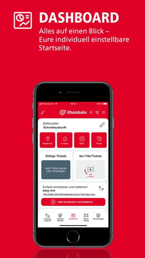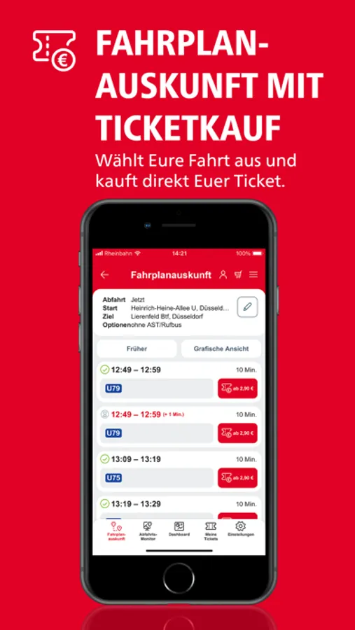 - DASHBOARD: When you open the App, your personal dashboard opens first with the main functions for travel around Düsseldorf by public transport (ÖPNV). You can buy the Deutschlandticket here, find an overview of the tickets you have bought and are valid, and can store your most important connections and lines in “Schnellauskunft” (Quick Information) or “Abfahrtsmonitor” (Departure Monitor).