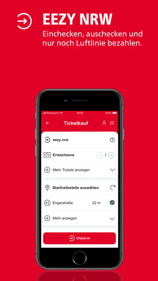 - EEZY.NRW: If you only travel occasionally by public transport in the Düsseldorf area then choose the Check-In-/Check-Out-Tarif eezy.nrw. Simply check in with the App and check out again at the end of your journey. The fare is calculated automatically according to the linear kilometres travelled. The total cost per month is no more than 49 euros.