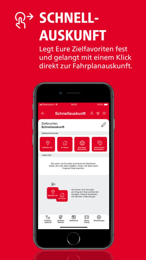 - INDIVIDUAL QUICK INFORMATION (INDIVIDUELLE SCHNELLAUSKUNFT): Simply drag and drop the icons for your start and destination favourites and the next connections will be displayed.