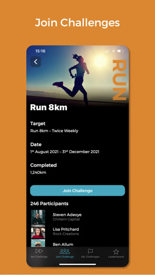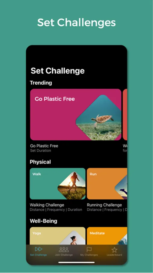 Keep track of your team's progress and watch in realtime the impact you've achieved. Whether you want to challenge friends or colleagues to go petrol free for a week, run 5km every day for a month or meditate for 10 minutes every other day, the goals, frequency and duration of any challenge are in your control.