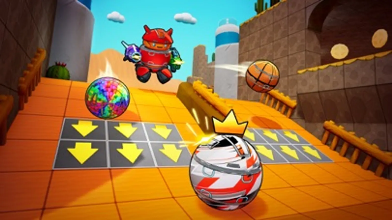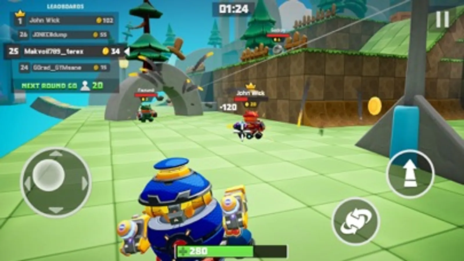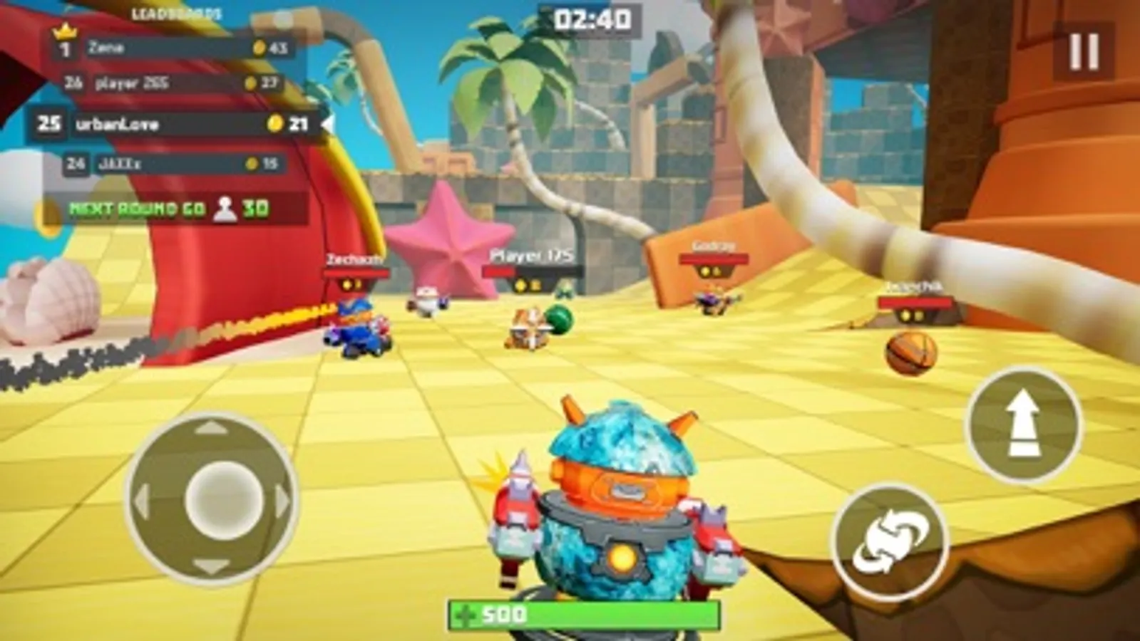 In this game, you'll face a challenging but fun battle! You will control a robot with a variety of guns! Your task is to collect the most coins until the round time expires. But it won't be as easy as you might think! Other players are here too, and they want to steal your coins! You can fight them off, destroy them and get their coins. Or, if the situation is not in your favour and you need to run - by pressing only one button, your robot can transform into a fast marble ball! That way, you can run away and avoid defeat. But remember - in that state, you cannot attack your opponents!