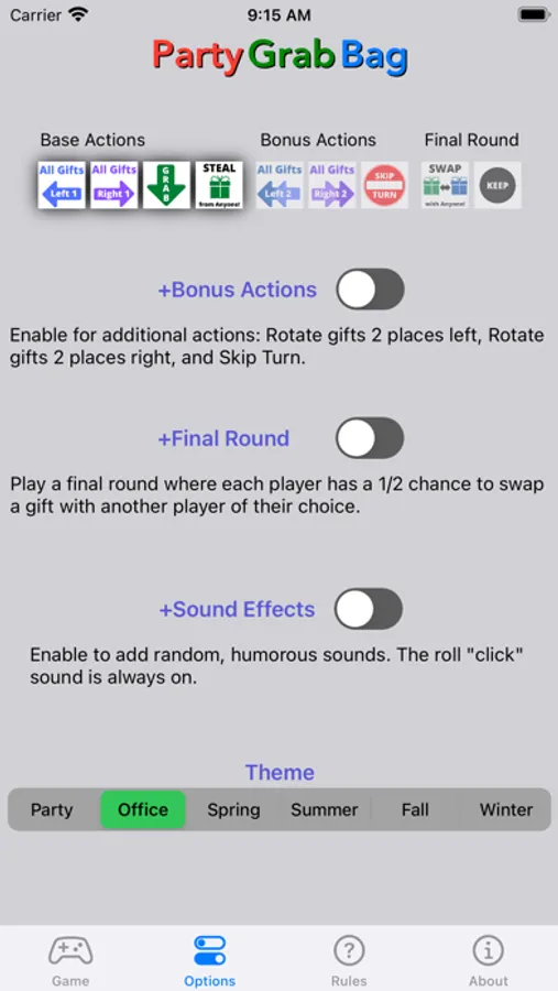 Traditional actions, such as "Rotate gifts Left", "Rotate gifts Right", "Grab gift from the center pile", and "Steal from anyone" already make this an unpredictable and exciting game.
