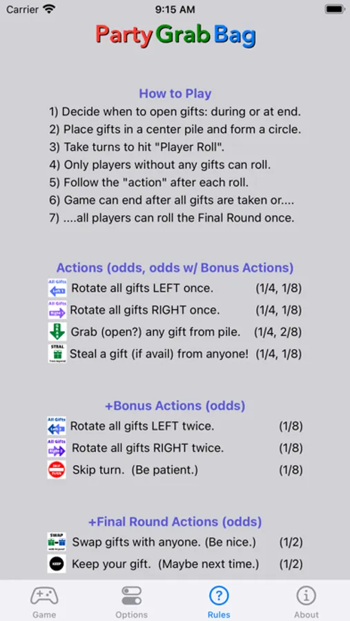 Was your last grab bag party memorable? Why not add some strategy and luck to grab that perfect gift? With this app, all players have a chance to grab, swap and steal from other players.