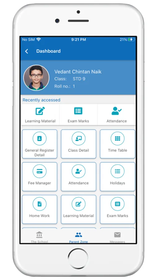 (2) Parent Zone - Parents can see their kid's personal records in this section. For example - General Register details, Time Table, Attendance, Exam Results, Home Work, Fee payments etc. Parents will have to register into the app using the same mobile number which is supplied for school General Register record.