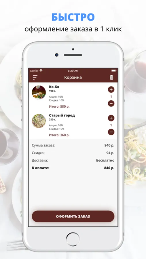 Установите приложение, выберите любимые блюда из нашего меню и оформите заказ всего в несколько кликов! Также в приложении Вы сможете получать и копить бонусы, отслеживать статус заказа, выбирать удобный способ оплаты и быть в курсе всех акций и новостей!