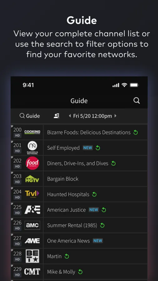 • Use the top filter bar to find content to stream, watch live, bookmark, or record