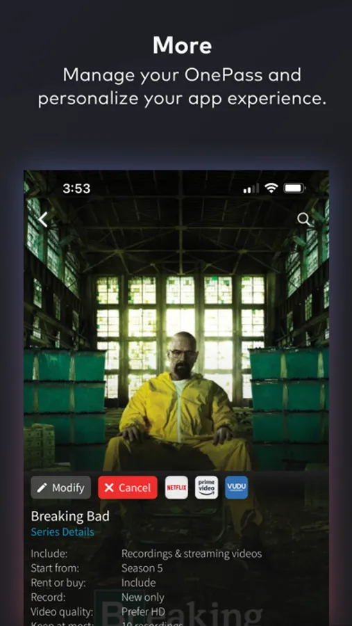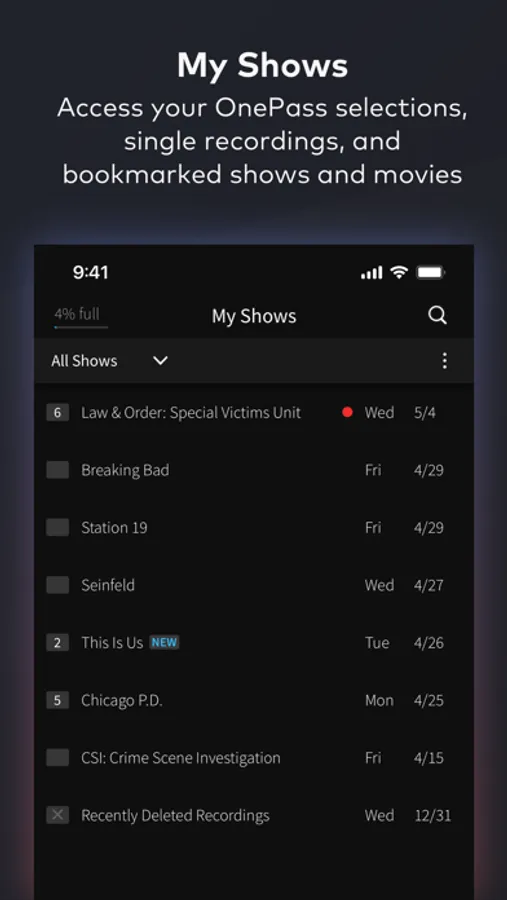 • Access your OnePass choices, single recordings, and bookmarked shows and movies