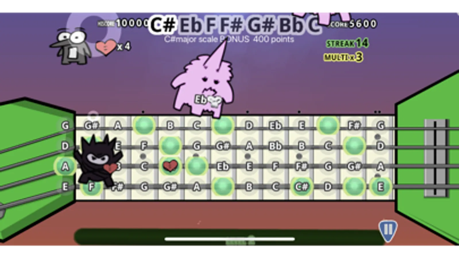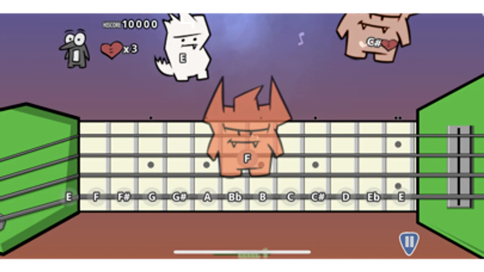 Match the notes, score health and points. Find note patterns and hints. Along the way learn patterns of notes on the guitar fretboard.