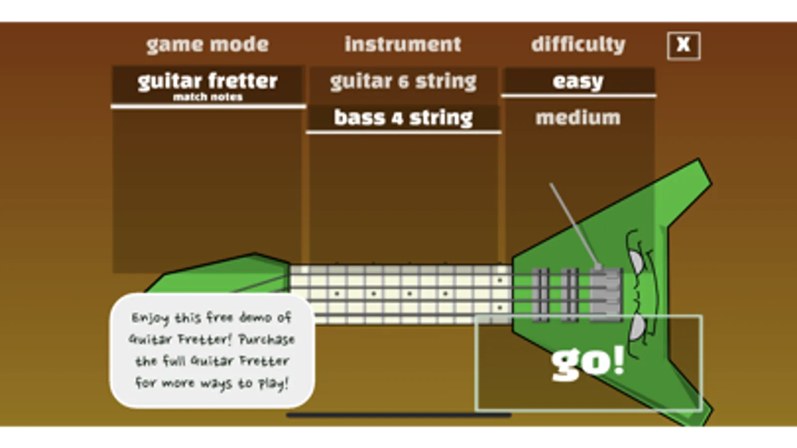 The full version of Guitar Fretter has more guitars, custom tuning, more levels, lefty-flip rotate the guitar 180, interactive guitar chart!