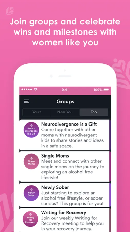 + Join groups specifically for single moms, moms of neurodivergent kids, newly sober moms, and many more to come!