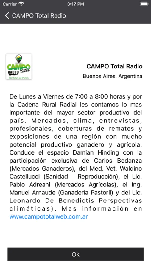 De Lunes a Viernes de 7:00 a 8:00 horas y por la Cadena Rural Radial les contamos lo mas importante del mayor sector productivo del país. Mercados, clima, entrevistas, profesionales, coberturas de remates y exposiciones de una región con mucho potencial productivo ganadero y agrícola. Conduce el espacio Damian Hinding con la participación exclusiva de Carlos Bodanza (Mercados Ganaderos), del Med. Vet. Waldino Castellucci (Sanidad Reproducción), el Lic. Pablo Adreani (Mercados Agrícolas), el Ing. Manuel Arnaude (Ganadería Pastoril) y del Lic. Leonardo De Benedictis Perspectivas climáticas). Mas información en www.campototalweb.com.ar