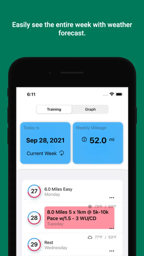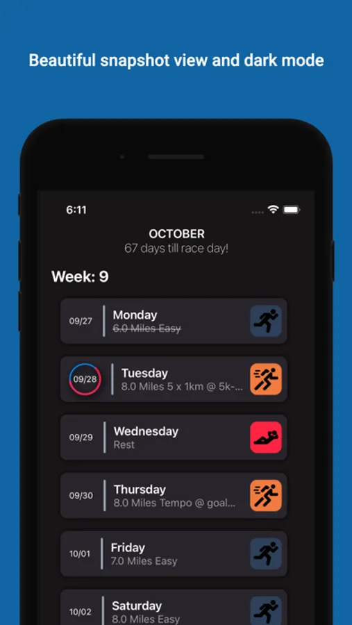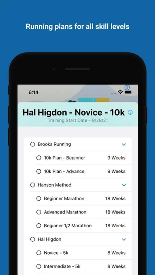 Runable provided training plans found freely online for various fitness levels from 5k to 50K. Runable will track your training week based on your Race Date.