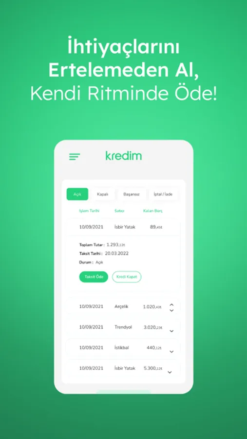 Sürpriz ücretler olmadan daha sonra öde. Kredim ile alışveriş yaptığında, tüm alışverişlerin ve ödemelerin hakkında eksiksiz bir bilgiye ulaşırsın. Hatta 'kredi kapat' ile kalan borcundan daha az ödersin.