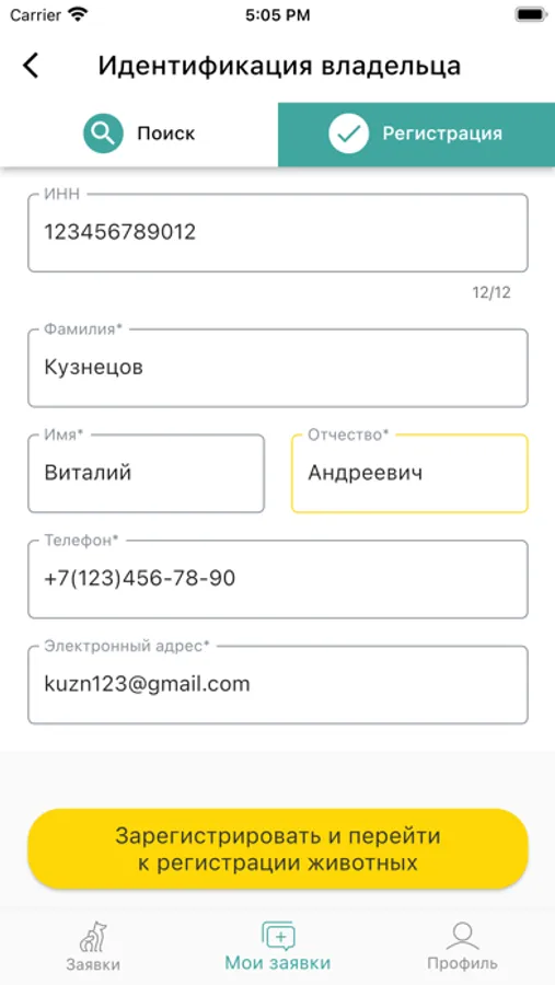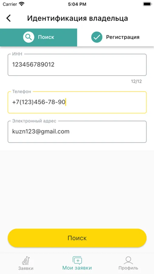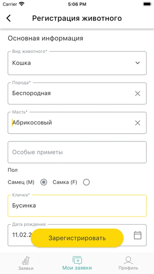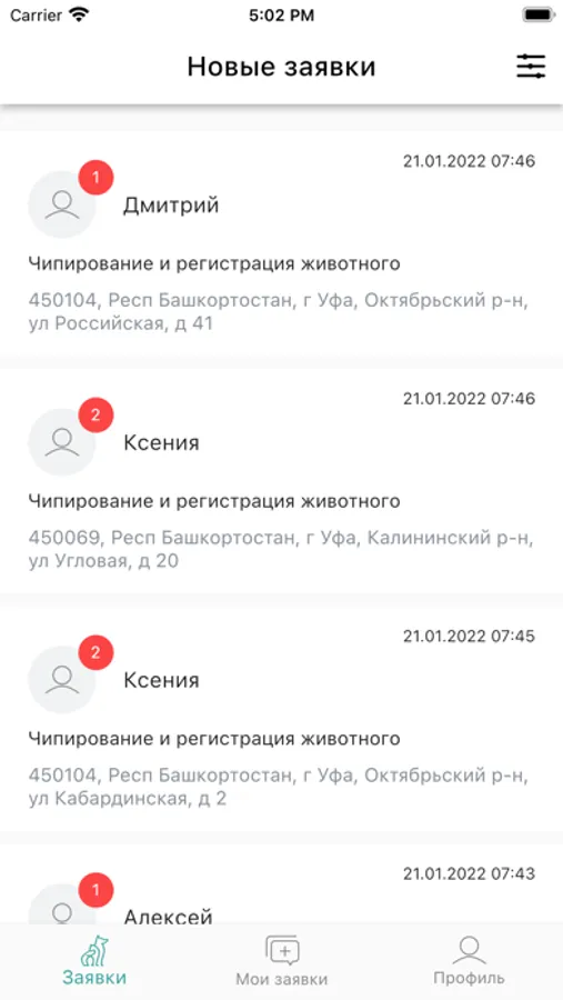 Приложение дает возможность получать заявки на регистрацию животных в режиме реального времени, выбирать подходящие заявки и подтверждать их выполнение. Заявки содержат информацию, позволяющую ветеринарному специалисту выбрать наиболее подходящую, с учетом местоположения животного и срочности предоставления услуги, и согласовать с владельцем дату и время визита.