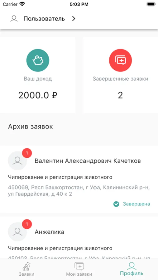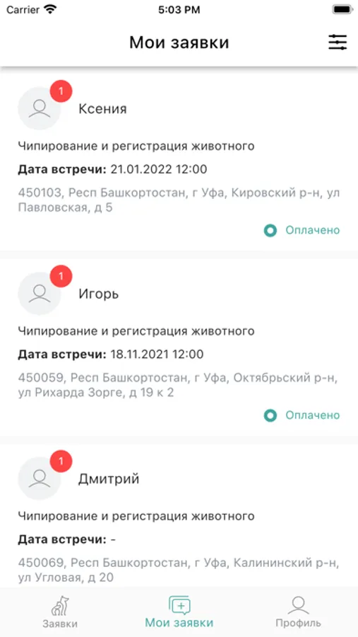 Выполненные заявки сохраняются в архиве заявок. Имеется возможность отменить заявку, если услуга не может быть осуществлена по независящим от ветеринарного специалиста причинам.