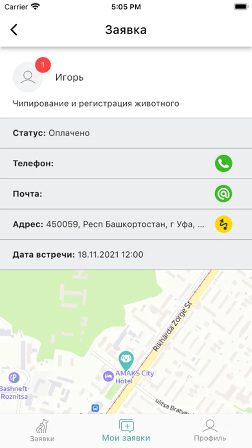 Выбор заявок для предоставления услуги осуществляется с помощью карты, на которой отображается местоположение (адреса) владельцев животных, подавших заявки на регистрацию питомца в домашних условиях. Приложение позволяет проложить маршрут к выбранному адресу и определить время в пути.