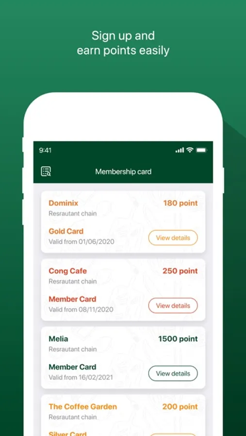 • Archive all membership cards of multiple restaurants in one place, no need to carry too many physical cards in your wallet.