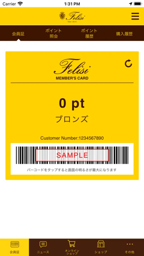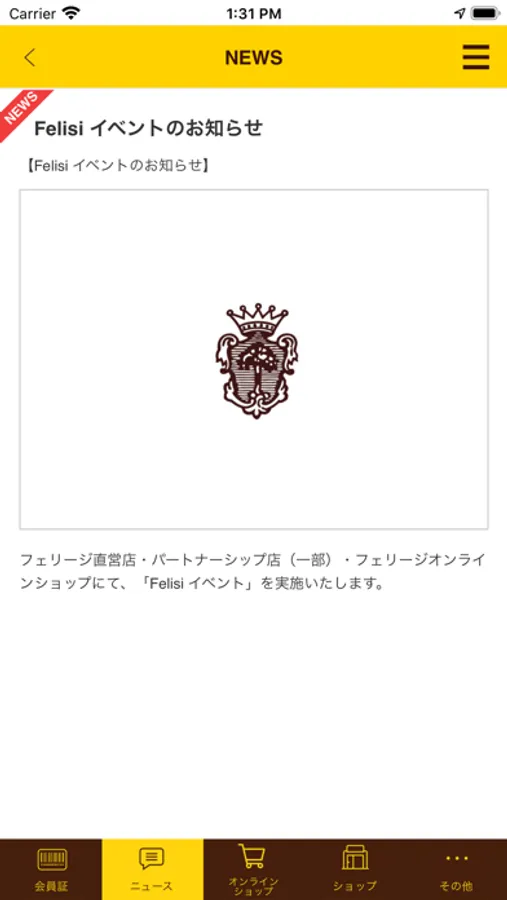 「Felisi」アプリは、株式会社フィーゴ直営店にて会員証としてご利用いただけるだけでなく、最新のお知らせや、オンラインショップでのお買い物が便利にご利用いただけるアプリです。