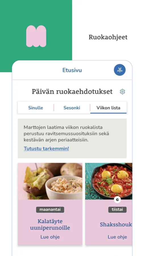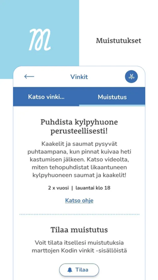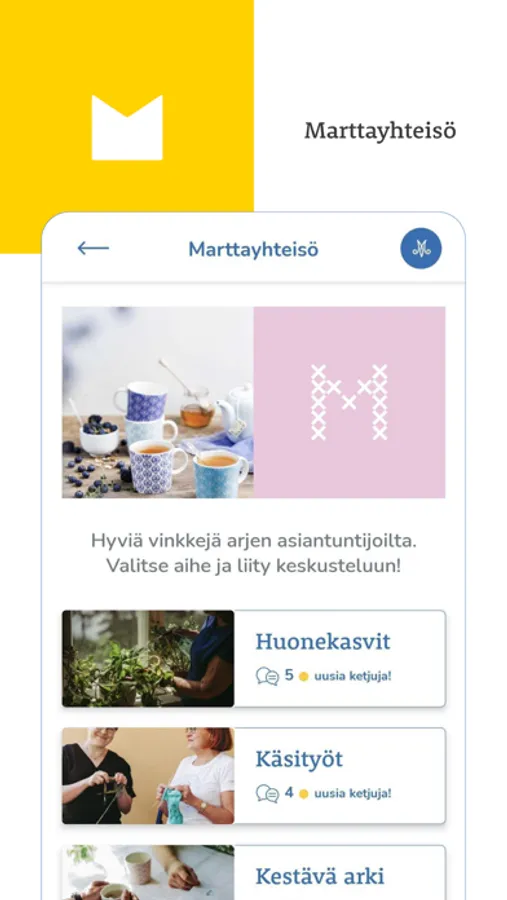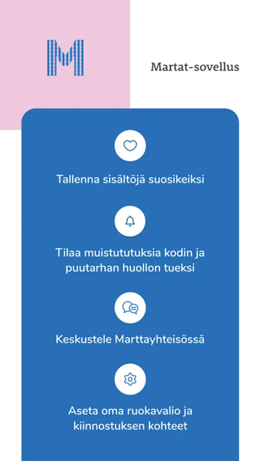 Voit tallentaa ja jakaa suosikkisi sekä tilata muistutuksia kodin askareista ja vinkeistä. Marttayhteisössä voit kysyä neuvoa arjen pulmiin ja jakaa parhaat niksisi muiden iloksi. Sovellus on kestävän arjen kokonaispaketti kaikille martoille ja marttamielisille. Tule mukaan!