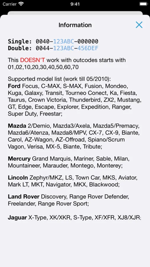 App works with models till May 2010 which has single (starts with 0040) or double outcode (starts with 0044).