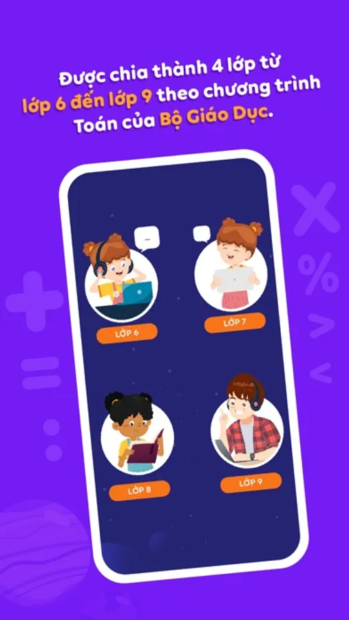 + Toán chuẩn BGD: được chia thành 4 lớp từ lớp 6 đến lớp 9 theo chương trình Toán của Bộ Giáo Dục hiện hành.