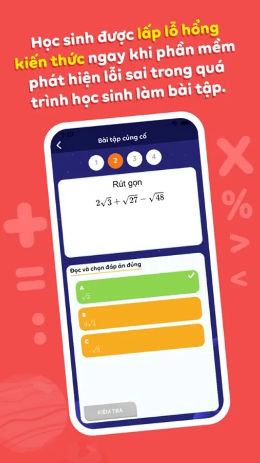 + Học sinh được lấp lỗ hổng kiến thức ngay khi phần mềm phát hiện lỗi sai trong quá trình học sinh làm bài tập.