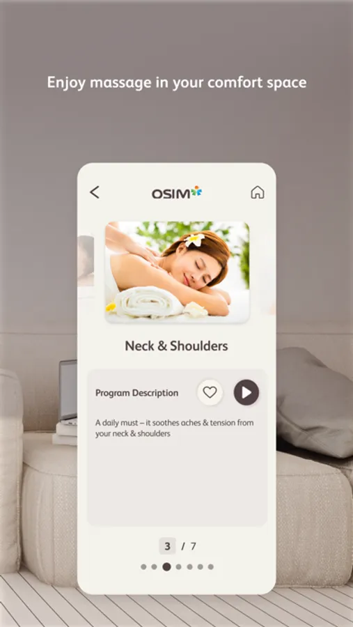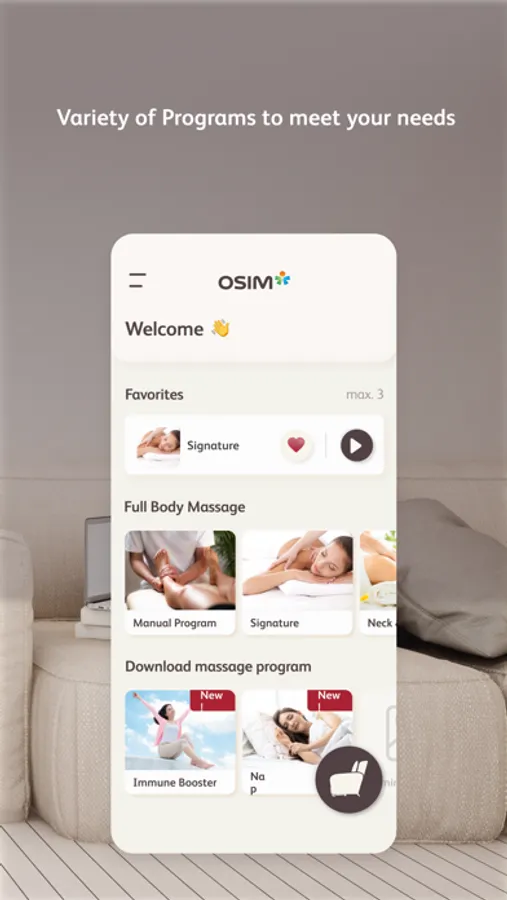 By leveraging on the advancement of smart devices and mobile app technology, this app pairs seamlessly with the OSIM uDiva 3 / 3 Plus Sofa. Offering full control, new download massage programs and relaxing music, a personalized massage is just at your fingertips.