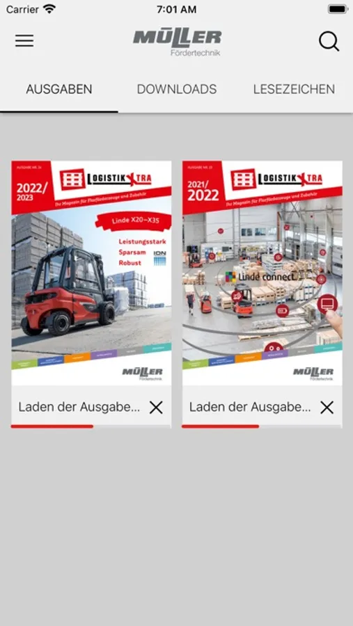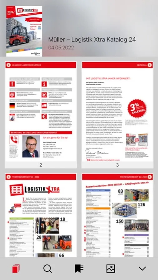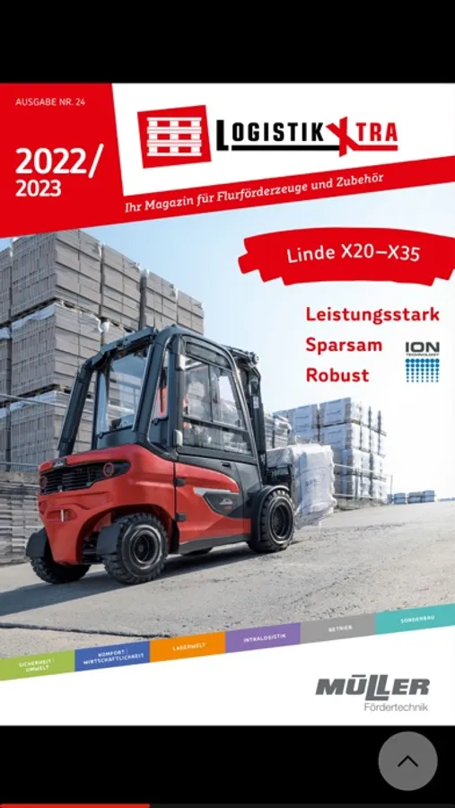 Stöbern Sie in der LX-Müller Kiosk App in den Katalogen, die aus der Kooperation zwischen Ernst Müller und Logistik Xtra entstanden sind, und statten Sie Ihren Betrieb mit Gabelstaplern, Hubwagen, Paletten, Regalen, Zubehör und vielem mehr aus.