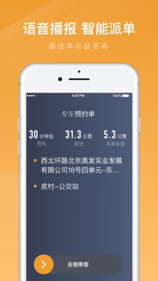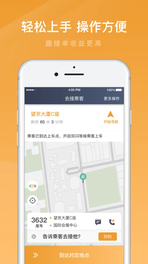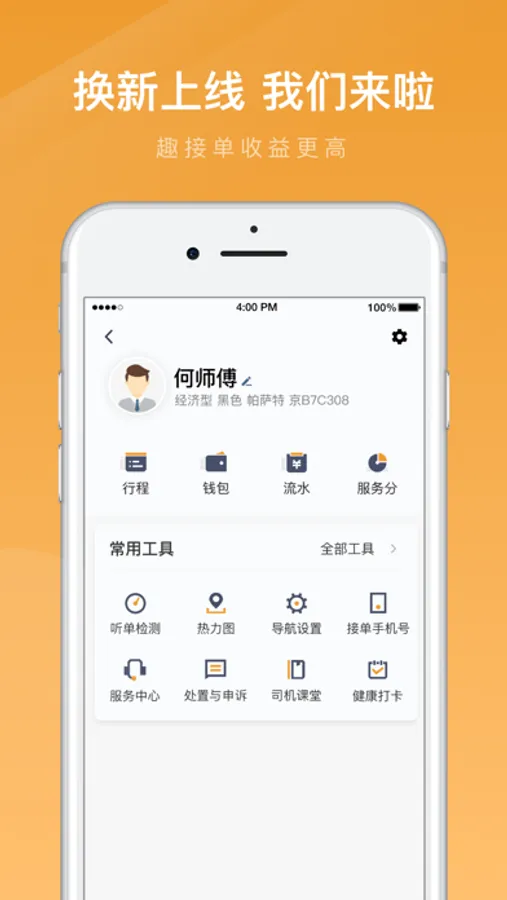 便捷的出车收班操作,人性化的接单设置,高效流畅的接单体验。
