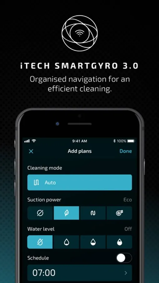 You can connect and control the robot with your Smartphone. You can choose between its different cleaning modes, the suction power, the scrubbing-mode flow level, program it once or several times a day, check the battery level and the cleaning record. In addition, you can see your home's interactive map as the robot cleans.