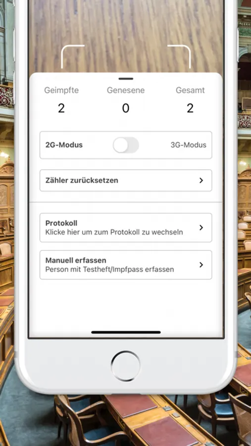 Digitale COVID Zertifikate der EU scannen, Impfzertifikate, Genesenenzertifikate und Testzertifikate, Zählung auch für nicht digitale Nachweise (z. B. Impfpass, schulisches Testheft) möglich