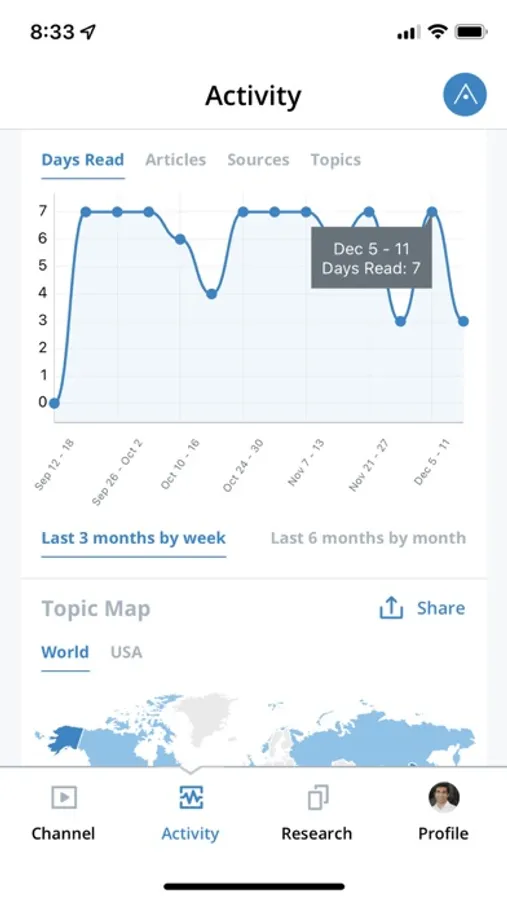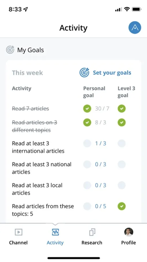 Our app also gives you an analysis of what you’re reading, and helps you set weekly goals to improve. We measure what you read on our app, and you can also share articles from other apps to AverPoint - like sharing a link to Twitter. Our app also integrates with our browser extension, which can measure what you read in the background.