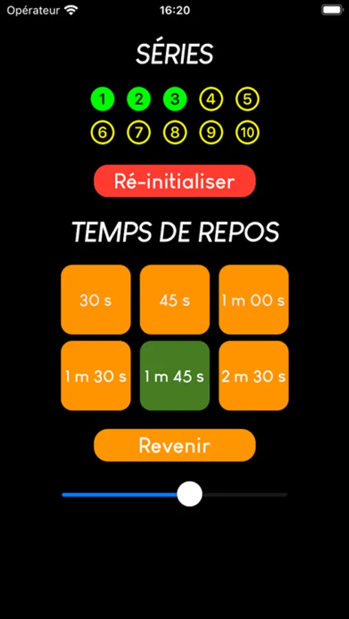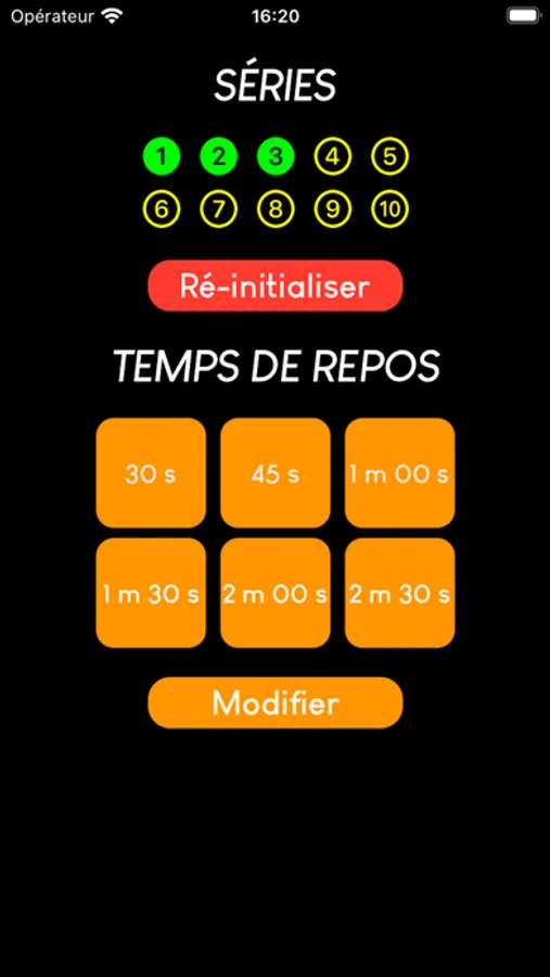 Les temps de repos sont pré-enregistrés et modifiables. Il suffi d'un clic pour lancer le chronomètre.