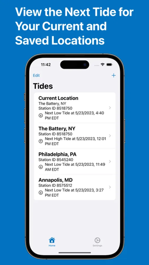 - Easily look at the time of the next high and low tides for your current location and saved locations