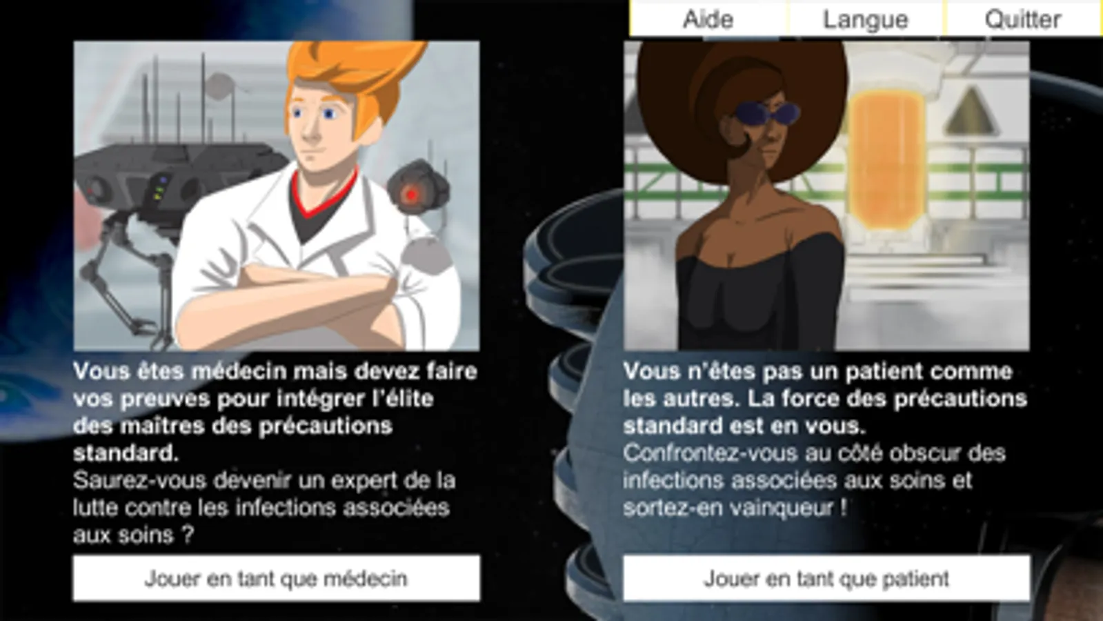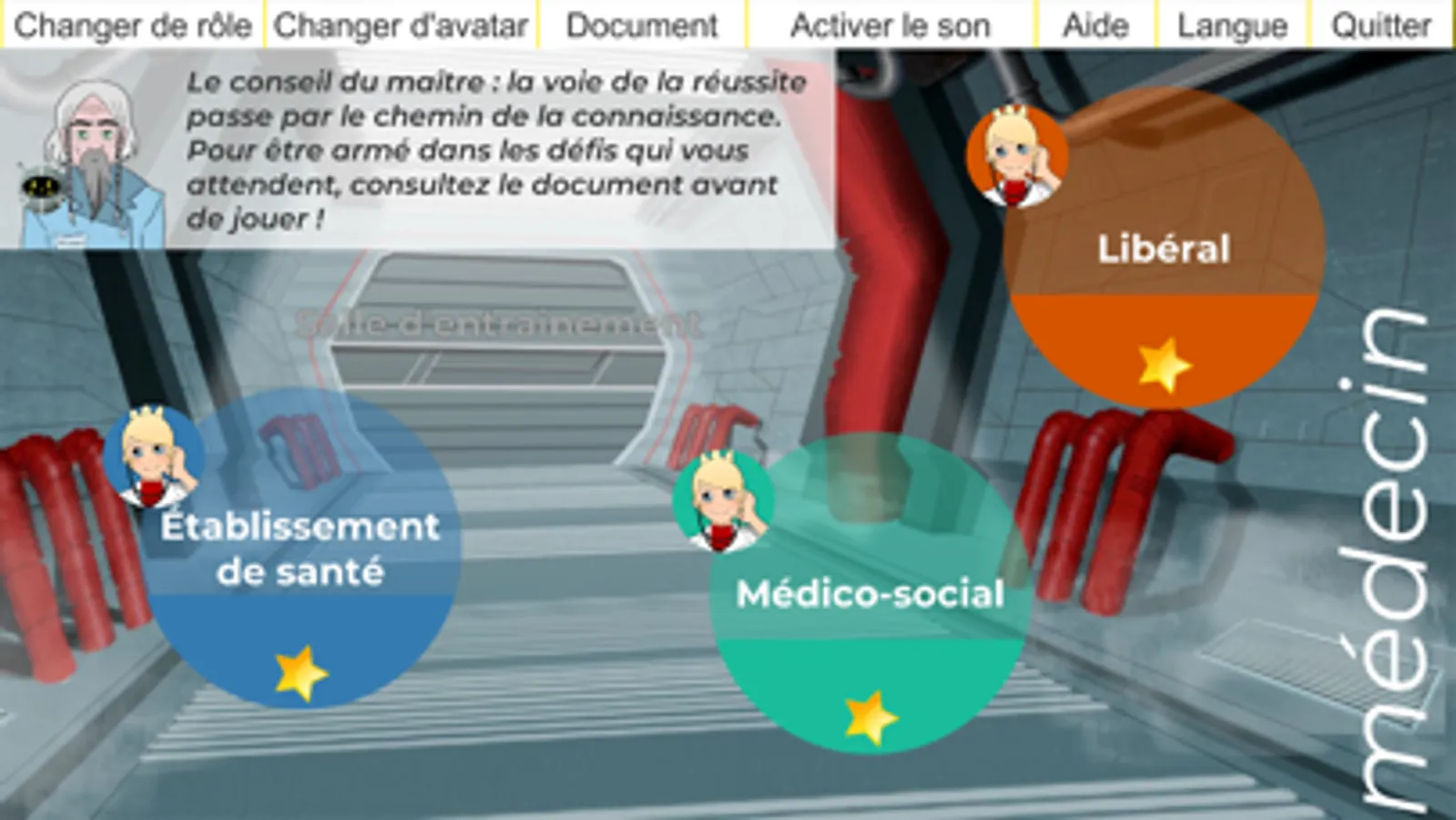 Testez-vous ! Choisissez votre avatar, médecin ou patient, et évoluez dans les 3 univers du parcours de soins : établissement de santé, médico-social, libéral. Vous ferez face à différentes situations cliniques et vous devrez choisir la bonne attitude pour progresser dans le jeu. A la clé, des passeports de compétence pour chacun des univers et un diplôme nominatif.