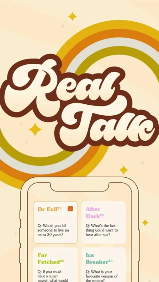 Real Talk presents a series of conversation starters - posing hypothetical situations, moral dilemmas and thought provoking questions which can be discussed in a group setting or with a partner. The App will alleviate you from boring, mundane small talk and is the new “must have” companion for social situations.