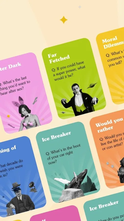 Select the categories of questions which you’d like to play with then press “Get talkin”. The free version will include up to 20 complimentary cards or else pay a small weekly fee to access ALL conversation starters across ALL categories.