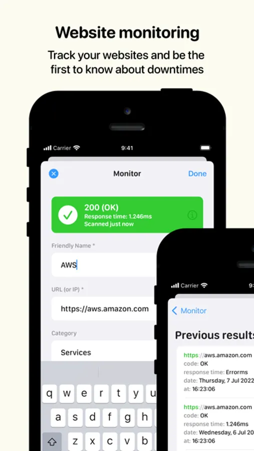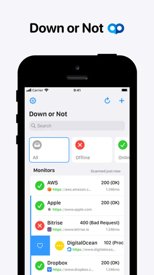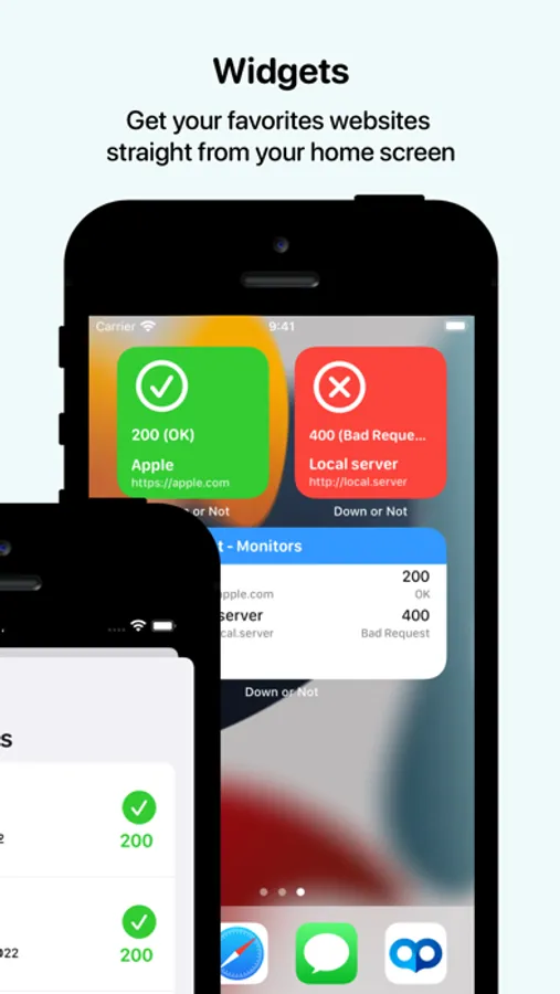 Down or Not is designed to have the best experience with Apple devices. It takes advantages of native features that you already are used to. There are beautiful widgets to help you to get your favorites websites status straight from your home screen. Keep your data up to date synced with iCloud and access them from other devices.
