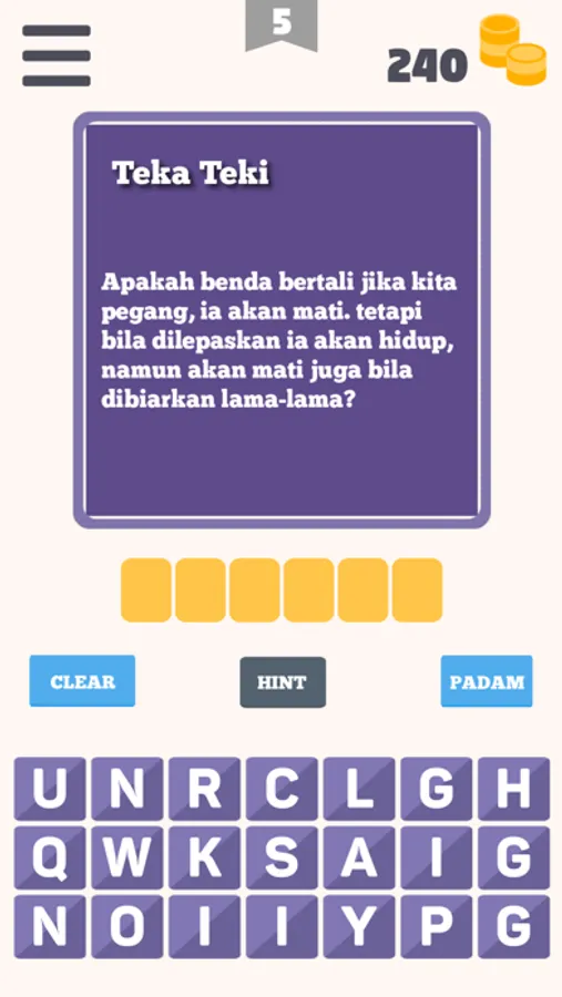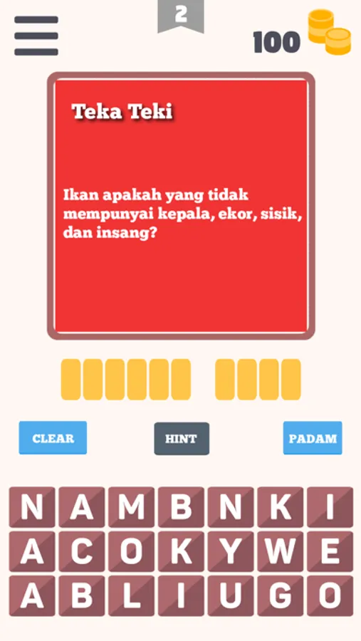 2- Jika anda tidak tahu jawapan, terdapat 3 button hint. Hint pertama, berikan satu huruf. Kedua, Buang beberapa huruf. Ketiga, berikan jawapan penuh.